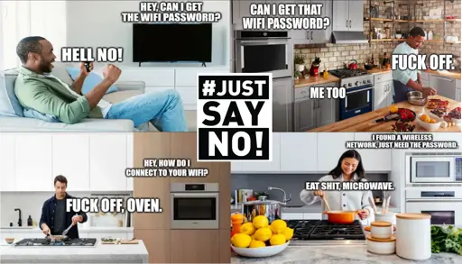 In retrospect, the microwave probably also generates enough interference in the 2.4-ish gigahertz range to disconnect itself from the Wi-Fi when it’s running anyhow. Genius plan, there. Mine certainly poleaxes any Wi-Fi or Bluetooth connections within a couple of feet of itself whenever it’s cooking.