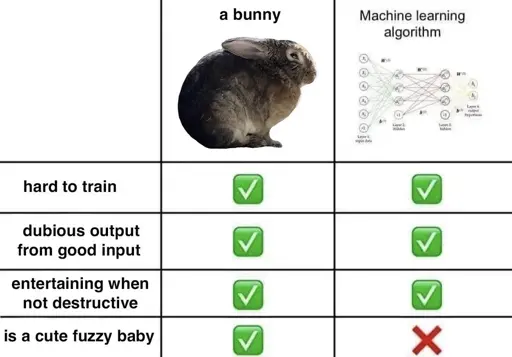 hydroptic@sopuli.xyz to Programmer Humor@lemmy.ml · 1 year agoManagement wants to know when the bunny will be ready for productionsopuli.xyzimagemessage-square2linkfedilinkarrow-up12arrow-down10
