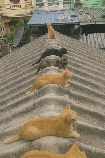 Young orange cat off in the distance: “Don’t you guys ever wonder about loafing on other roofs?”