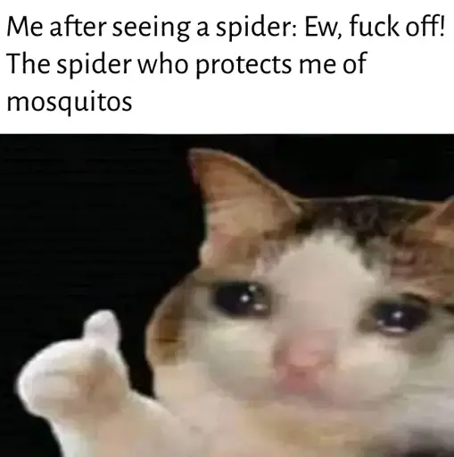 minus-squareUna@europe.publinkfedilinkarrow-up9·edit-25 days agoTrue, that’s why I let them be in the corner (other insects and bugs however are they classified can fuck off) but I do clean my room, just leave spiders be in the corner. We split the room.