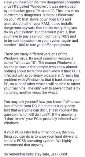 alexei_1917 [mirror/your pronouns]@hexbear.netOPto Linux@lemmy.ml•Be on the lookout for this scary piece of malware! Your tech illiterate relatives' PCs are probably already infected!English1·5 days agoNice. Always neat to see that virus removed from a home. Are you running a Windows free home, then, or is it just your own individual tech that’s malware free?